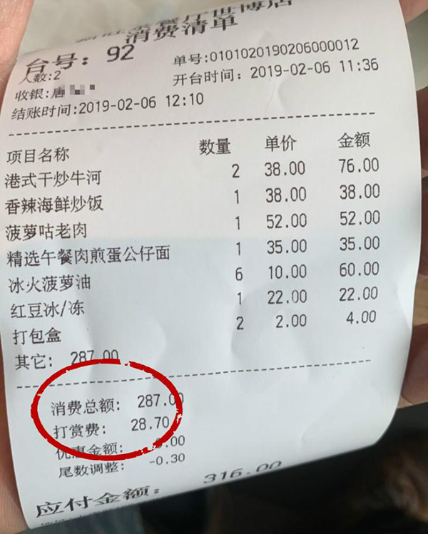 来自黄浦区的胡先生是2月5日晚上到新旺茶餐厅汉口路店用餐。吃完饭到前台结账时,发现小票上显示了10%“打赏费”,这让他和其他等待结账的顾客都对这笔费用十分惊讶:“打赏费”应该是“自愿”,否则就是变相加价了。服务员解释称:“这是领导的要求的。”服务员还指了指大门口张贴的一张手写的红纸说,门口有公告。而这张公告的大意是“向伟大的服务员致敬”,在一堆文字中,确实提到了要加收10%这个数字。他认为,仅仅一张红纸作为告知是远远不够的。“一笔费用可能就几十块,但假设有1000个单子,就是好几万的事情。”