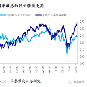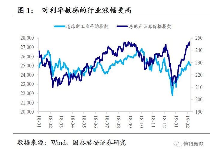 流动性收紧预期缓释后,美股迎来19年开门红。随着美联储货币政策紧缩节奏放缓,联邦政府关门的负面效应衰减,中美贸易谈判有达成协议可能,美股迎来19年开门红:1月份,标普500涨7.89%,道指涨7.21%,纳指涨9.74%。标普和道指创2015年以来最大单月涨幅,纳指创2011年10月份以来最大单月涨幅。对利率敏感的行业跑赢了大盘,地产指数从12月的低点反弹了超过16%。