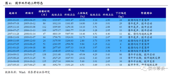 3. 从股债双牛的三种形态看后续市场演绎路径总结历史上15次股债双牛,平均持续时间为79天,股市平均上涨幅度为14.68%,10Y国债收益率平均下行幅度为29bp。结合股市与债市分别所处的阶段特征,一般呈现出以下三种形态: