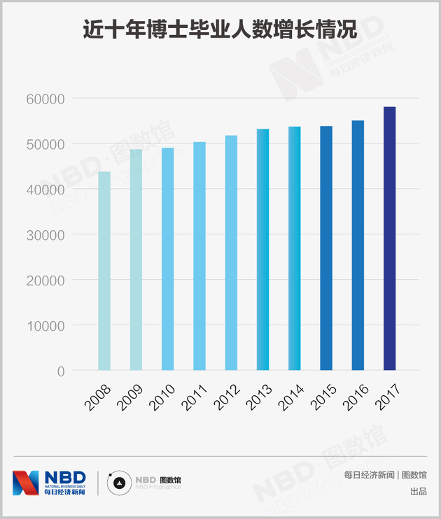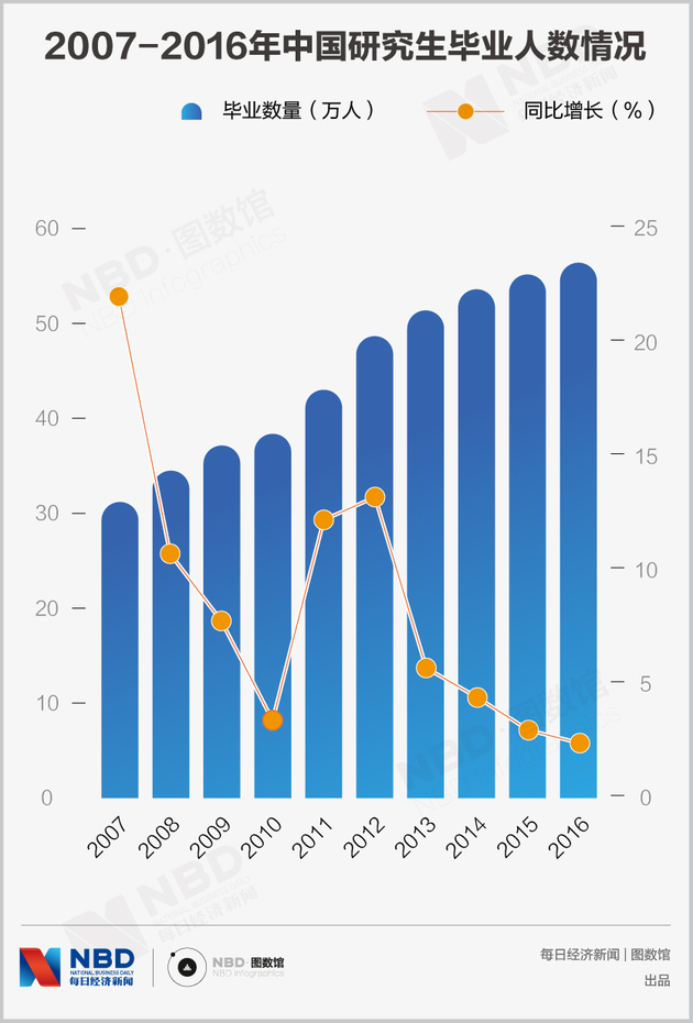 对比来看,2008年研究生毕业人数为34.48万人,同比增长10.6%,2016年研究生毕业人数则为56.39万人,同比增长2.3%,增长幅度缩小。