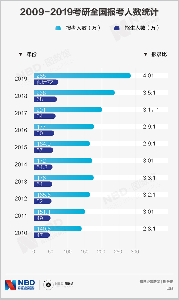 从报录比来看,2010年为2.8:1,2019年则为4:1,对比十年数据,研究生规模增大,但竞争也同样有所加大。