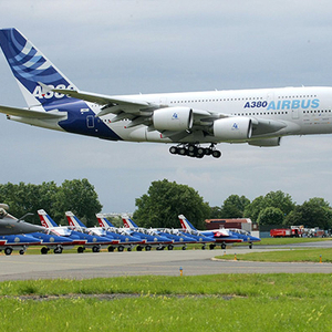 A380是空客于1996年4月研制生产的四引擎、555座级超大型远程宽体客机,航程15200千米,有空中巨无霸之称。该机型2005年4月27日首航,2007年10月25日第一次商业飞行。2009年7月9日,新加坡航空开通首班新加坡至香港A380航班。2011年10月17日,A380飞机正式执行中国大陆第一个载客飞行任务,首飞北京到广州航线。2016年,阿联酋航空曾使用巨无霸A380客机执飞当时世界最长航线迪拜-奥克兰。