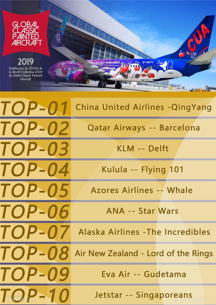 在巴黎时间2月13日上午08时发布的2019全球经典彩绘飞机十强榜单(Publication du TOP10 de la World Collection 2019 du Global Classic Painted Aircraft)中,中国联航“庆阳号”彩喷飞机经评审委员会严格审计,尤其对飞机重量环保影响、艺术设计价值评估、等多维度全面化的评审,再度蝉联世界飞机彩绘榜单TOP-01,一举超越了:荷兰皇家、新西兰航空、卡塔尔航空等老牌航空企业。