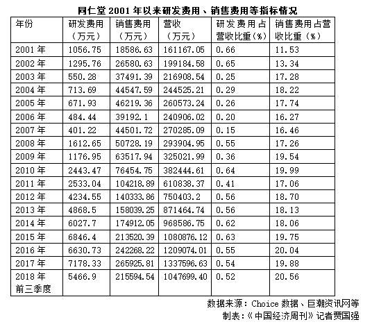 除了质量安全问题,《中国经济周刊》记者统计发现,自2001年至2018年前三季度,同仁堂在研发投入方面较为薄弱,研发费用占营收比重一直保持在较低水平。