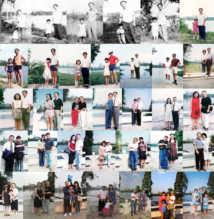 我和女儿从1979年开始,每年都在镇江金山塔湖边合影。