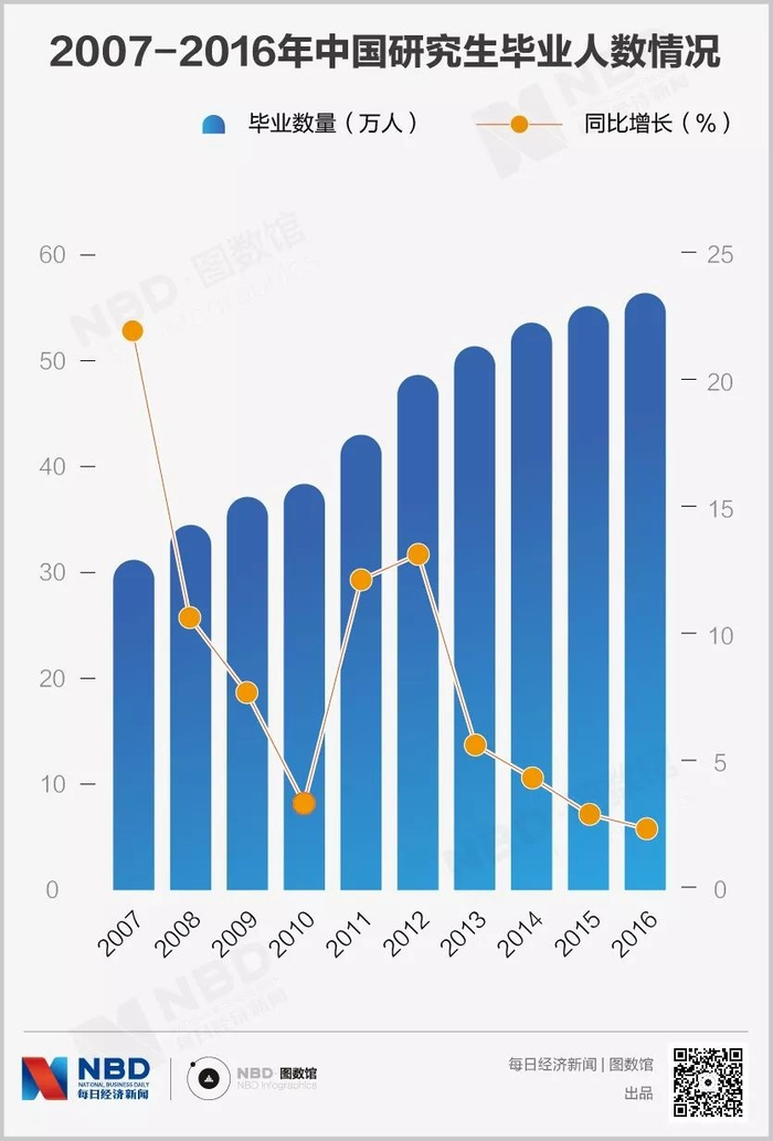 对比来看,2008年研究生毕业人数为34.48万人,同比增长10.6%,2016年研究生毕业人数则为56.39万人,同比增长2.3%,增长幅度缩小。