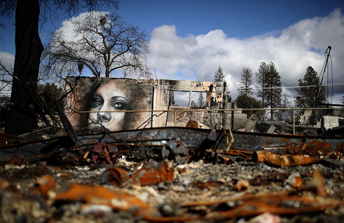 当地时间2019年2月11日,美国加州天堂镇,前涂鸦艺术家Shane Grammer在被烧毁的建筑物和汽车上作画。在致命的“坎普”山火发生三个月后,该社区开始重建进程。