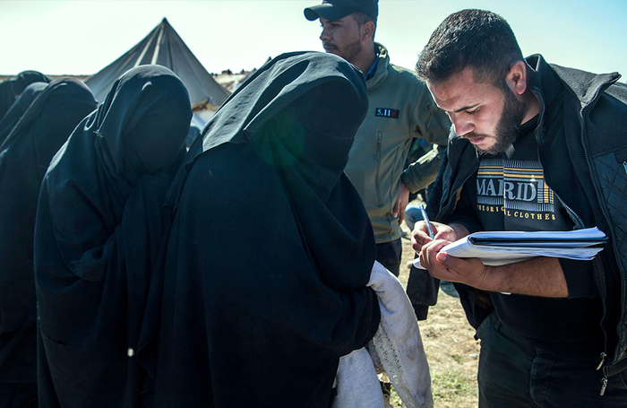 2019年2月12日,美国支持的叙利亚民主力量(SDF)对数百名伊斯兰国圣战分子进行驱逐行动,当地妇女在逃出伊斯兰国控制区时进行登记。