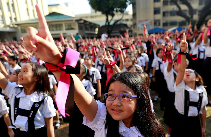 当地时间2019年2月14日,菲律宾马尼拉,当地一个学校的学生在情人节庆祝活动中一齐跳舞,呼吁结束对妇女和儿童的暴力行为。