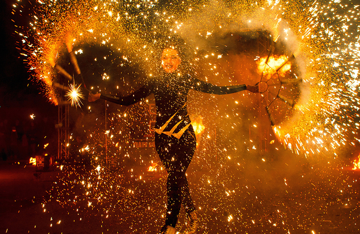 2019年2月10日,乌克兰西部乌日赫罗德,舞蹈演员在帕拉钦塔节闭幕式上进行传统篝火表演,与游客一起告别冬天,迎接春天。