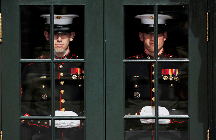 当地时间2019年2月13日,美国华盛顿,美国总统特朗普和第一夫人梅拉尼娅在白宫椭圆形办公室会见来美访问的哥伦比亚总统伊万•杜克夫妇。