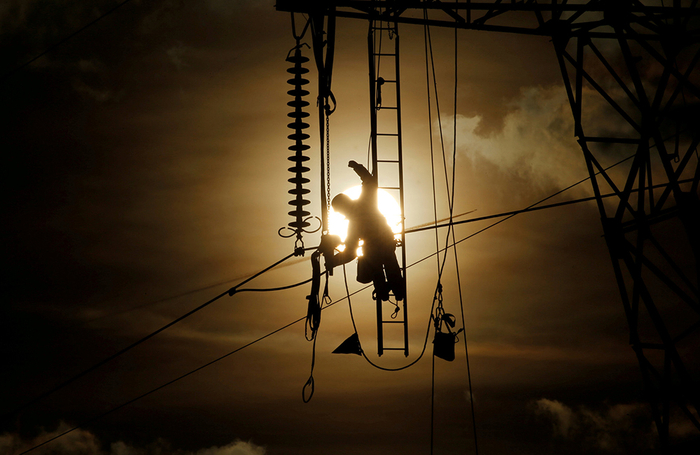 2019年2月11日,日落时分,法国罗耶,一名技术人员正在维修高压电线塔。