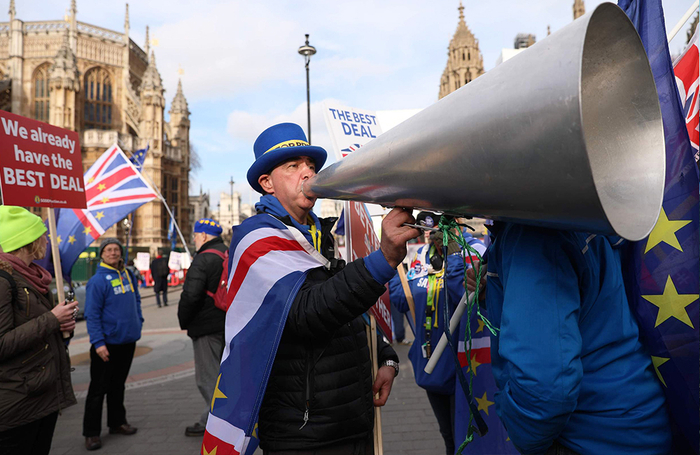2019年2月13日,在伦敦议会大厦外,反对英国退欧、支持欧盟的示威者对着扩音器大喊。