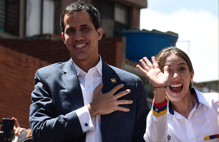 2019年2月12日,委内瑞拉反对派领袖、自称代理总统的胡安•瓜伊多(左)在妻子法比安娜•罗萨莱斯(Fabiana Rosales)的陪同下,抵达加拉加斯东部一场要求军方接受美国人道主义援助的集会。政府和反对派之间的拉锯战集中在是否允许人道主义援助进入这个经济陷入困境的国家,这个国家正遭受食品、药品和其他基本物资的短缺。