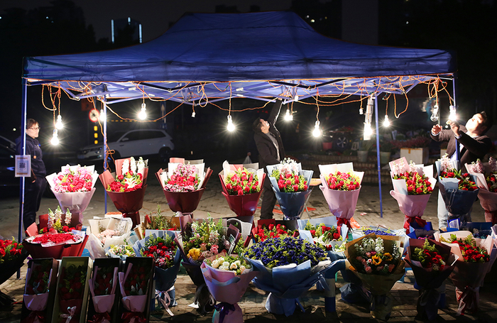 2019年2月13日,重庆江北区洋河路,临近情人节,玫瑰花已经摆上街头。商家正在安装简易帐篷里的电灯。