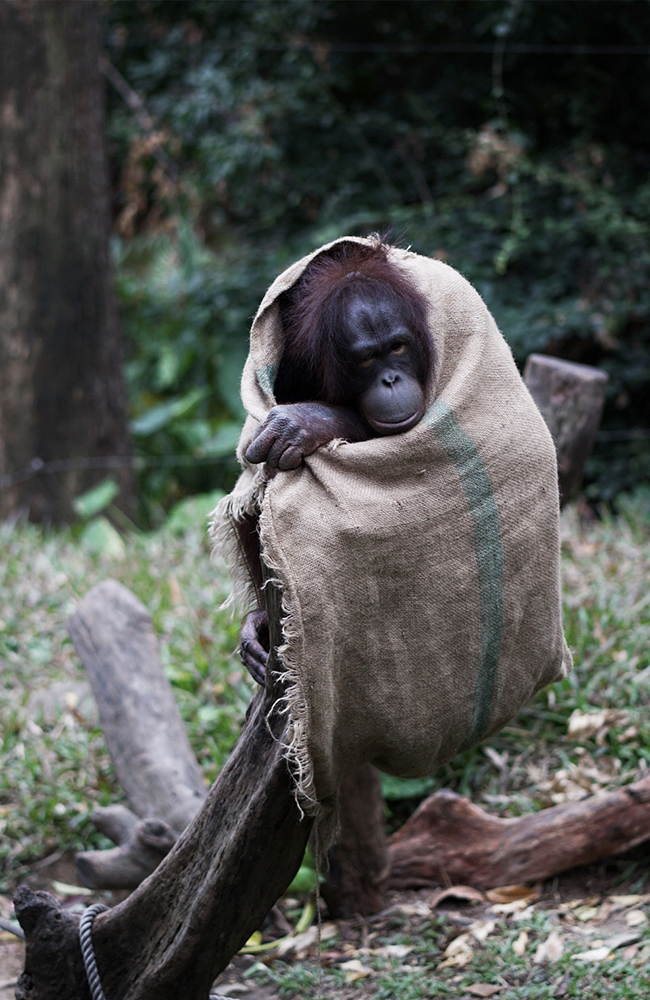 2019年2月11日,广州长隆野生动物园11岁的母猩猩“三毛”用麻袋包裹身体取暖。由于遭遇节后降温,广州处于湿冷状态。
