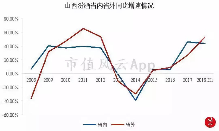 而从省内省外销售收入增速看,2018年上半年省外销售收入增速已超过省内。