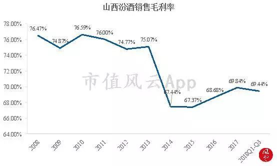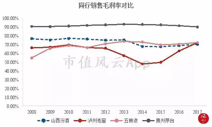 实际上,与二线白酒对比,公司2017年约70%的销售毛利率在行业中并不具较大优势:2017年度,水井坊的销售毛利率为79.06%,酒鬼酒为77.94%,舍得酒业为74.61%。