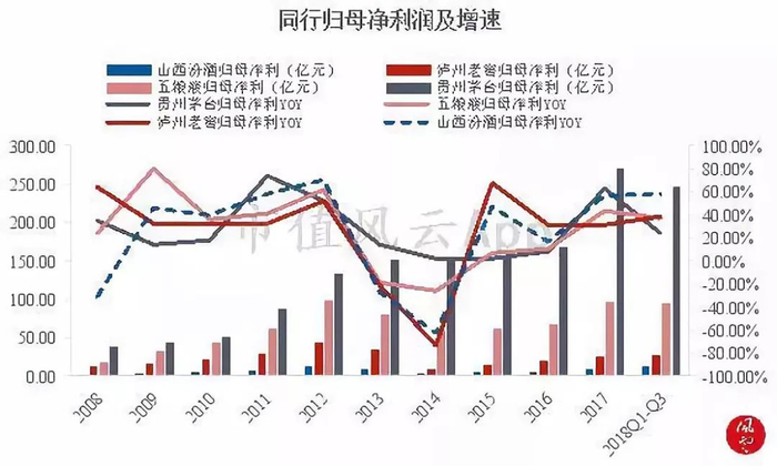 归母净利润呈现与营收同样的增长比对情况,也在2018年前三季度领跑其他三家白酒上市公司。
