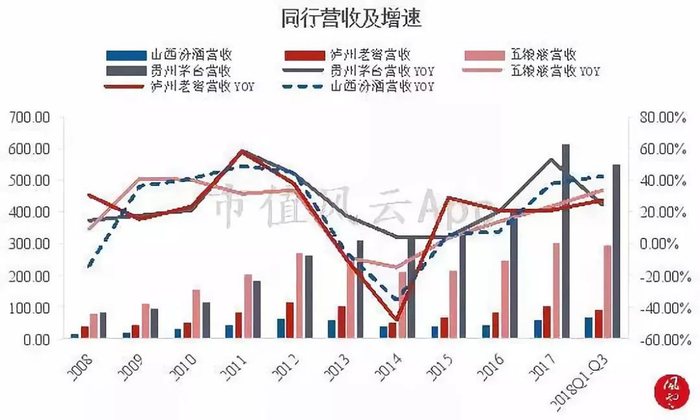 2017年度,山西汾酒同比37.06%的营收增速除不如贵州茅台外,增速已赶超泸州老窖与五粮液,2018年前三季度,其增速在四家白酒企业中达到最大。