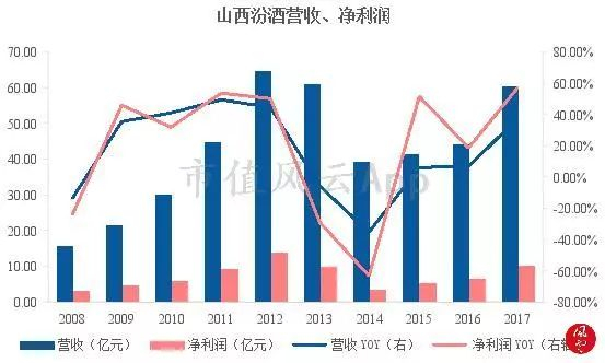 2017年,山西省国资委将控股股东汾酒集团作为全省国企目标责任书改革试点单位,公司推动国企改革,业绩开启了新一轮快速增长。2017年,公司营收、净利润同比分别增长了37.06%和56.52%。