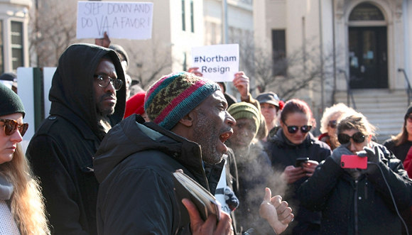 抗议者在弗吉尼亚州政府门口举牌,要求州长拉尔夫·诺瑟姆辞职。2019年2月2日摄图片来源:Jay Paul/Reuters