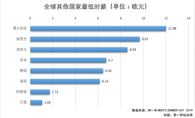 令人感到意外的是,从数据上看,西欧地区垫底的两个国家分别是德国(9.19欧元)和英国(8.85欧元),不过英国有点“冤”,因为从今年4月1日起,英国法定最低时薪有所上调,但由于近来脱欧不确定性日渐增加,英镑汇率持续疲软,拖了英国后腿。