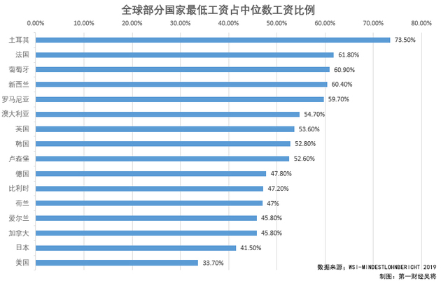 报告表明,尽管近年来欧洲最低时薪有所增加,但离中位数的60%还相差甚远,就当前数据来看,欧洲只有土耳其(73.5%)、法国(61.8%)和葡萄牙(60.9%)达到了标准。