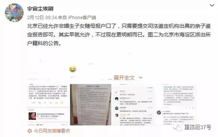 ▲网友爆料北京允许非婚生子女随母报户口。微博截图