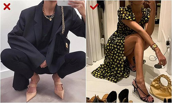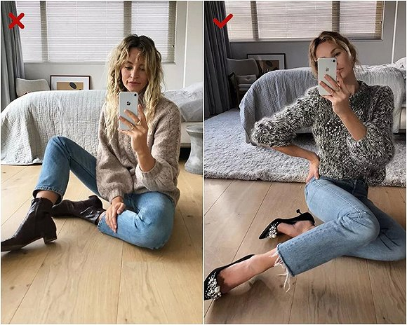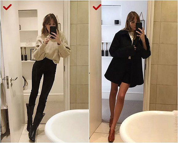 现在还流行蹲着拍,千万别老老实实正面对着镜子,身子侧一点,再把脚推出去,是不是好看多了,对比一下。▼
