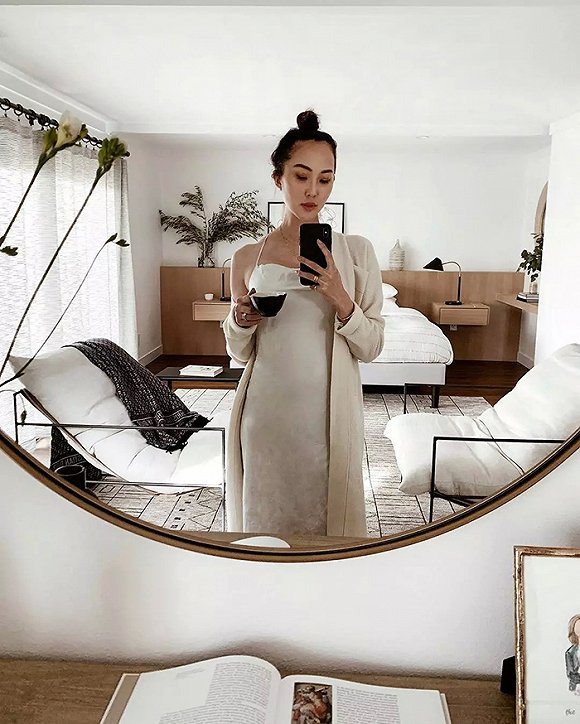 刷到Eva Chen 的照片,她一直在工作室楼梯旁的大镜子前自拍,虽然环境没有怎么布置,但干干净净的还蛮舒服,也能突出穿搭重点。▼