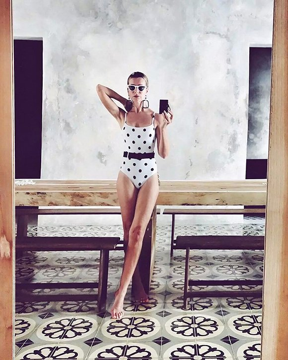 不走寻常路的Leandra的一只脚自拍早已成为她的标志性pose。抬高一条腿,踩着柜子拍。
