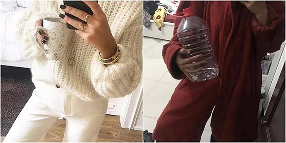 我刚开始镜前自拍时,有一天研究别人怎么拍,就发了一张图(左)在群里问“这种要怎么拍”,我的新助理大吉行动力超强地一分钟内发了张示范图给我(右),结果在微博一发,大家的关注点之一就是“大吉家里好乱”。▼