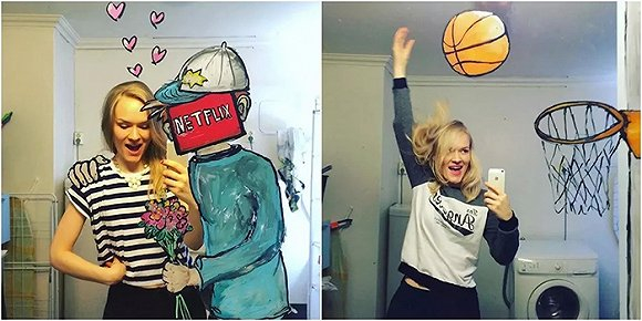 不过,这些都比不过来自挪威的创意自拍艺术家Helene Meldahl,她每次自拍前都会先在镜子上画画,然后戏精上身地摆各种表情和pose~▼