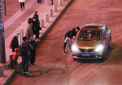 2月15日晚,西单一些乘客站在马路上等车,一辆“黑车”司机正在和乘客“讨价还价”。 2月14日晚,滴滴APP显示有上百人在排队候车,预计等待1小时以上。 2月14日晚10时,数辆“黑车”在工人体育场北路上揽客,堵塞交通。A06-A07版摄影/新京报记者 王贵彬 2月15日晚11时30分,北京站大批乘客出站后排队等待乘坐出租车。