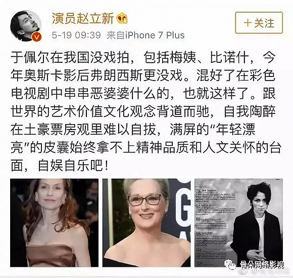 男演员赵立新曾经就此事在微博上公开发表言论,抨击这一行业现象。“于佩尔在我国没戏拍,包括梅姨、比诺什,今年奥斯卡影后弗兰西斯更没戏。混好了,在彩色电视剧中串串恶婆婆什么的,也就这样了。满屏’年轻漂亮’的皮囊始终拿不上精神品质和人文关怀的台面,自娱自乐吧!”