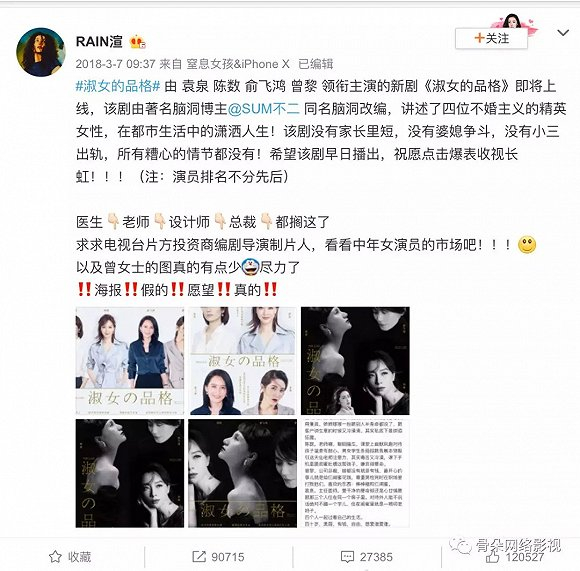令人没想到的是,另外一名为“RAIN渲”的网友直接根据这个创意发布设计了多款角色海报,得到了广泛关注和认可,微博也被陈数和曾黎转发。直到五月份,壹心娱乐官微发布消息称电视剧《淑女的品格》正式立项,陈数作为主演已经加入。