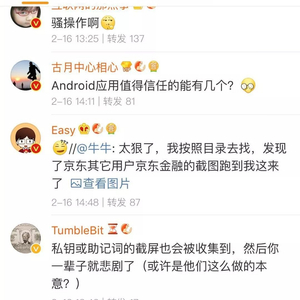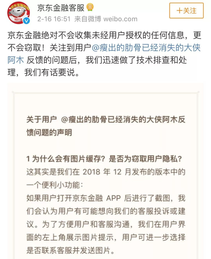 2月16日,微博网友@瘦出的肋骨已经消失的大侠阿木 发布视频称,京东金融App会获取用户的敏感图片并上传。