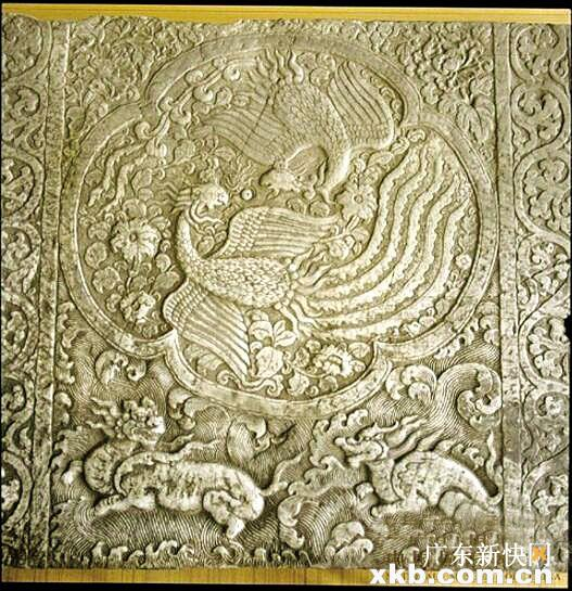 北京市桦皮厂西部明代城墙墙基出土。该石雕画面主体使用了四连弧的开光装饰形式,中以缠枝纹衬托双凤戏珠图案。