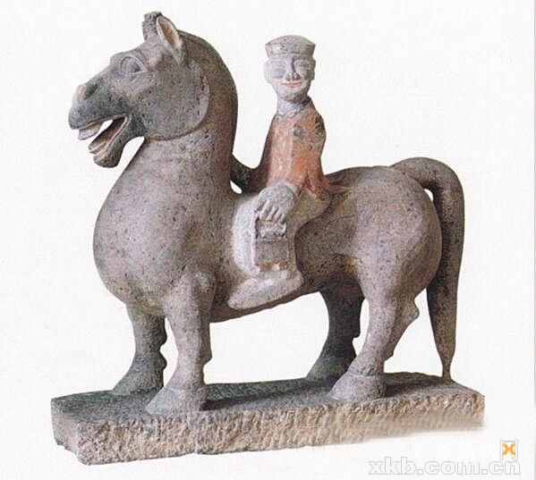 东汉时期,雕塑艺术风格较西汉有较大变化。西汉的石雕作品一般造出大体轮廓,力求简练,东汉则出现了用线条来表现细部,如衣饰、家禽的羽毛等。这件彩绘石骑马人,系用整块石灰石雕成,骑马的童仆戴黑色平巾帻,着红地白色流云纹剪襟短衣,粉地红色流云纹大口裤,左手提椭圆形酒椑,右手提鱼两尾,作欣欣然沽酒买鱼归来之状,总体造型古拙雄浑,细部刻画又生动传神,为东汉石雕艺术的精品。这种题材的石雕,在汉代也为仅见。