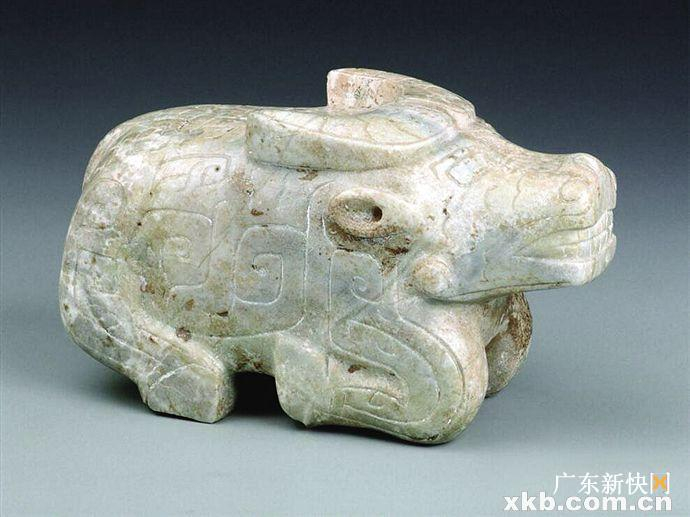 河南安阳殷墟妇好墓出土。石质为白色大理岩,圆雕卧牛,前肢跪地,后肢前屈,短尾下垂。头部微昂,双角后伏,细眉,眉间刻一菱形纹。方目,耳后抿, 张口露齿。牛身饰卷云纹,角、背脊、尾部饰节状纹,下颌刻铭“后辛”。