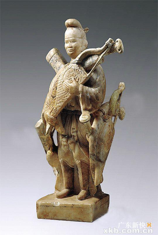 河北省望都县出土。此石雕系用整块石灰石雕成,骑马的童仆头戴黑色平巾帻,身着红地白色流云纹剪襟短衣、粉地红色流云纹大口裤,左手提酒椑,右手提两尾鱼,作欣欣然买酒归来状。