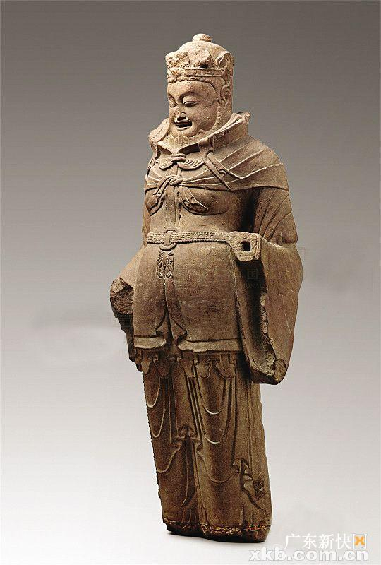 四川成都万佛寺遗址出土。唐代石雕艺术偏重于佛教题材。这件唐代石刻天王像,造型丰腴挺秀,雕法圆熟精炼,糅合了黄河流域的浑厚质朴风格与当地传统。造像由细砂岩雕制,手臂残缺,服饰、造型不似内地佛教造像护法天王像。