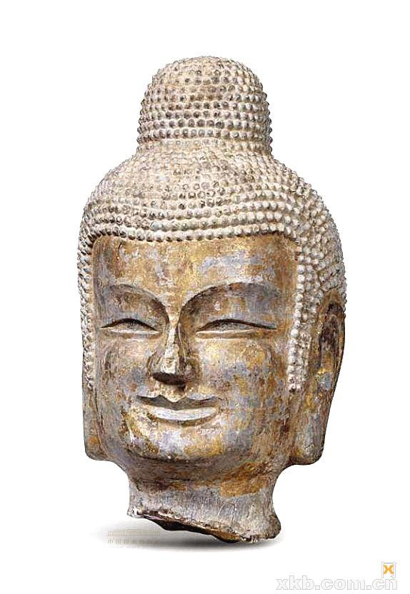 山东青州龙兴寺窖藏出土。此头像为高肉髻,面相清秀,眉眼细长而舒展,嘴角两侧雕刻成浅凹状,传神地表达出佛像惬意、睿智微笑的神态。