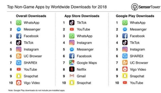 近期来自全球应用市场研究公司Sensor Tower的数据显示,2018年度,抖音、UC浏览器、茄子快传、火山小视频四款中国应用跻身苹果和谷歌两大应用商店的合计全球下载量Top 10。