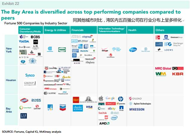 湾区内支柱产业功能分区成熟,差异化定位明显。旧金山市以旅游、商业和金融发展见长;东湾以重工业,金属加工和船运为核;北湾葡萄酒业发展良好;南湾是硅谷的所在地;连接旧金山市和南湾的半岛,则地产业发达。湾区内产业具备多样化齐头发展实力。其他传统港口城市群所具有的发达产业,旧金山湾区依旧具备且功能分区明显,发展突出。截至2014年,世界五百强公司中有30家总部坐落于湾区内,其中包括谷歌,苹果等科技巨头,数量仅次于纽约。