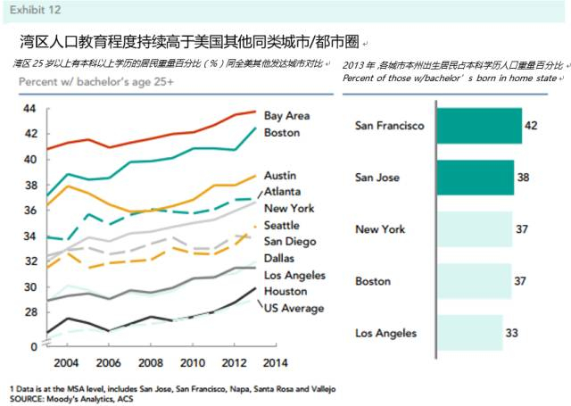教育优势和人才储备,是硅谷这一模式发展起来的基础因素之一。湾区舒适的气候条件、深厚扎实的经济产业基础以及开放的文化,吸引了学者,高等教育机构和研究所在湾区内聚集、生长。湾区内共有公立大学34所,私立大学49所,五个国家级研究实验室,是名副其实的科教创新重地。2008年,湾区高校学生有大约58.8万名。2013年,湾区25岁以上人口中,受高等教育的比例为42%,不仅远高于美国平均的28%,也高于波士顿和纽约。