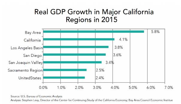 加州主要地区2015年实际GDP增长(%)