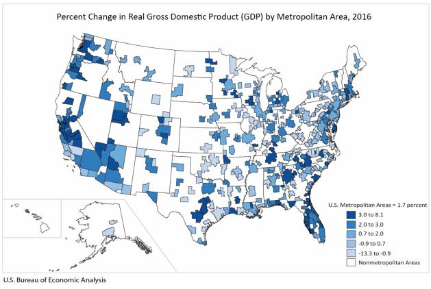 全美境内大都会区2016年实际GDP增速(%)