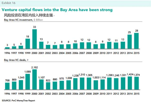配套发达的风险投资也是硅谷发展的重要因素。硅谷具备的正是能将科技研究发展形成对应的产业发展的商业环境,也就是我们常说的技术“变现”。而风险投资的发展则助力了“变现”的重要过程。成熟的风险投资发展除了资金支持外,还会给创业公司提供投后管理在内的一切服务支持。下图显示了湾区内风险投资每年的总额及交易量变化,从1996年至2015年,湾区内风险投资持续走强,从最开始的30亿美金发展到逾280亿美金一年。每年投资项目平均一千起以上。